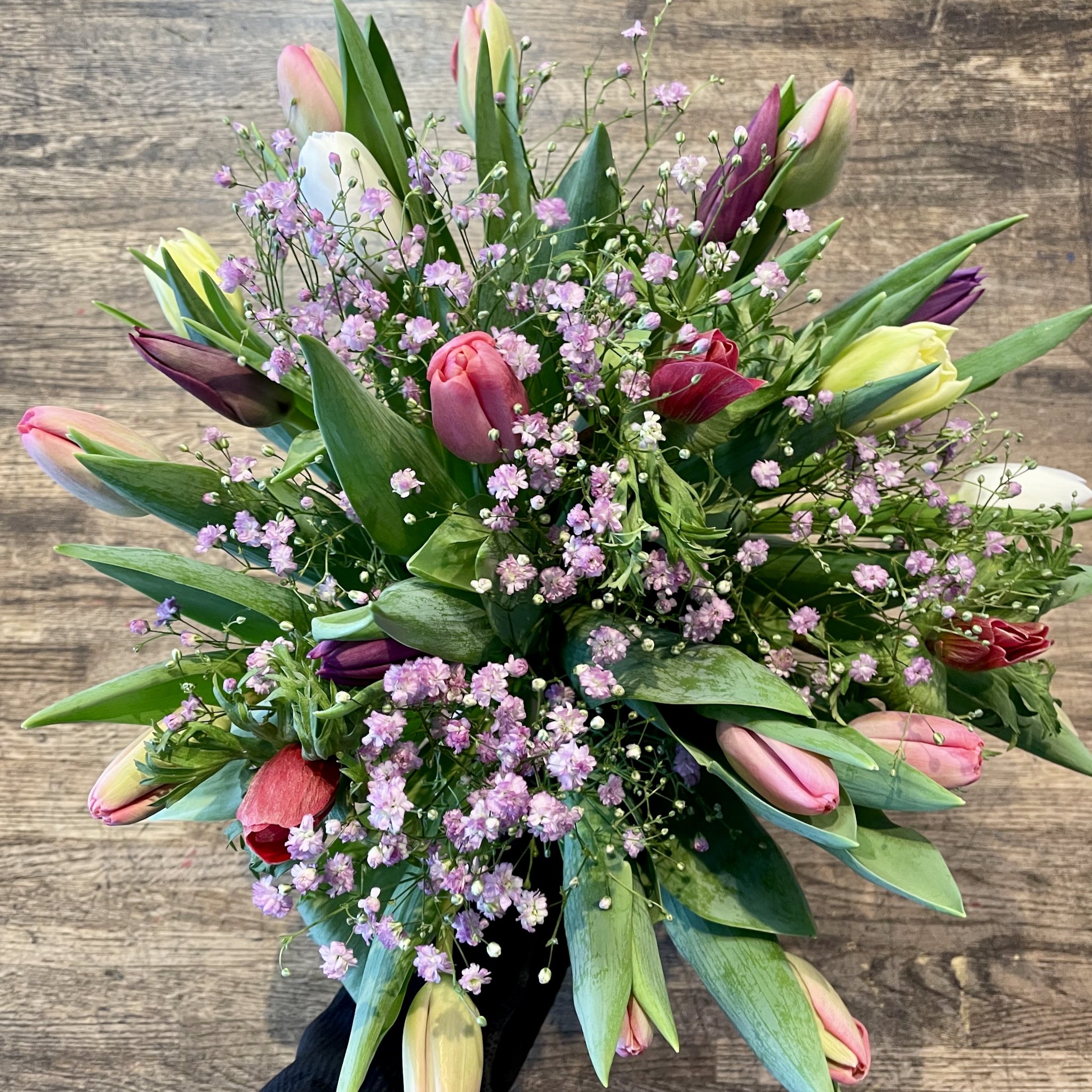 Bukett med 20st blandade tulpaner med brudslöja från 350kr (på bild 385kr)